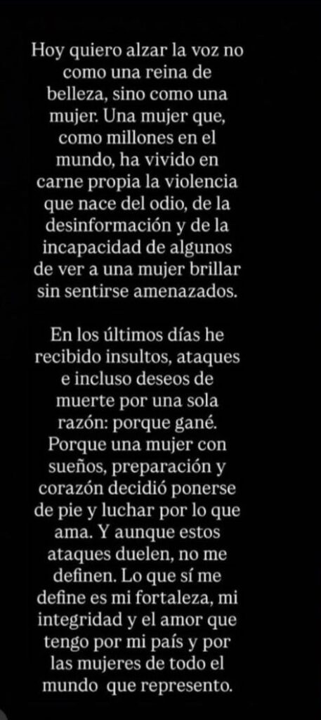 “En los últimos días he recibido insultos, ataques e incluso deseos de muerte por una sola razón: porque gané. Porque una mujer con sueños, preparación y corazón decidió ponerse de pie y luchar por lo que ama. Y aunque estos ataques duelen, no me definen. Lo que sí me define es la fortaleza, mi integridad y el amor que tengo por mi país y por las mujeres de todo el mundo que represento”.