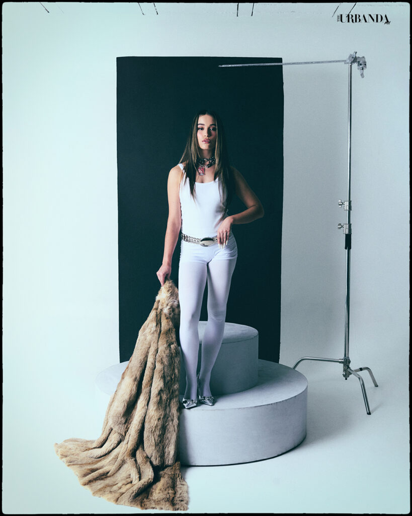 Las fotografías muestran a Las Villa con outfits que resaltan su individualidad y conexión, usando tonos blancos y negros como símbolos de equilibrio. Prendas Y2K, texturas como plumas dan vida a este universo visual donde cada elemento cuenta una historia de fuerza, introspección y transformación.