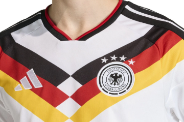 El jersey de Alemania apuesta por un diseño elegante en blanco con detalles negros y dorados. Adidas incluyó un patrón geométrico en el torso que simboliza unidad y fuerza. La camiseta mantiene la sobriedad característica de la selección alemana, pero con un toque contemporáneo que la convierte en una de las más sofisticadas del torneo.