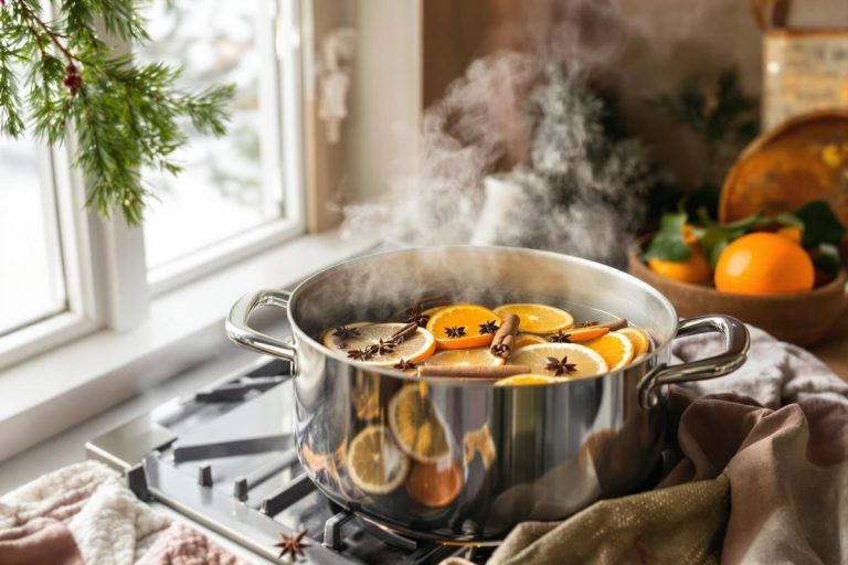 Una de las formas más sencillas de llenar tu hogar con aroma navideño es preparar una infusión aromática en la estufa. Solo necesitas una olla con agua y algunos ingredientes clave: rodajas de naranja o limón, ramas de canela, clavos de olor, anís estrella y un poco de jengibre fresco. Deja hervir a fuego bajo y permite que el vapor perfumine cada rincón de la casa.